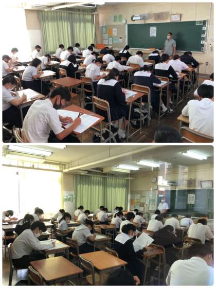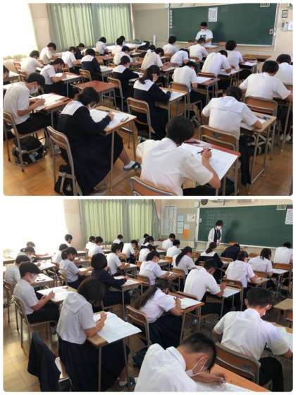 本日、3年生は実力テストに取り組んでいます。英語、国語、社会、理科、数学の順番にテストをしています。