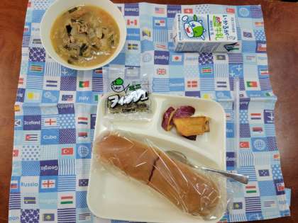 【献立】 豚肉といかの中華煮 大学いも ミニフィッシュ 黒糖パン