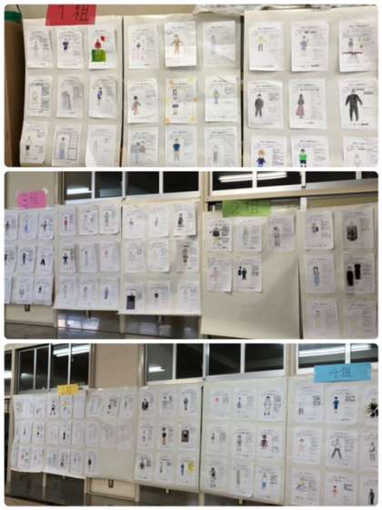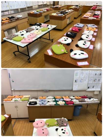 家庭科の作品、3年生は幼児向けの動物座布団、1年生は自分らしいコーディネートについてまとめました。