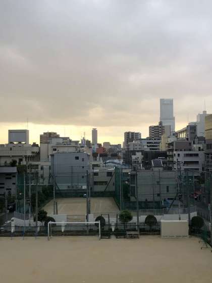 今朝は風が強く、雨も少し降っています。南の方の空は明るい部分も見えますが、全体的にどんよりとしています。