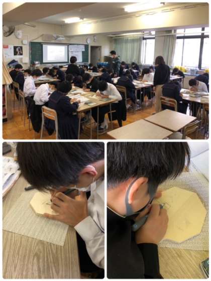 彫刻刀で薬研彫りと菱合い彫りに取り組みました。みんな黙々と集中して取り組んでいました。