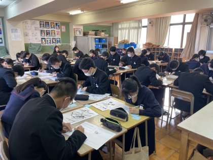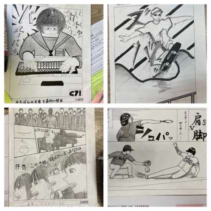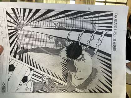 2学期最後の美術の授業は漫画の相互鑑賞でした。表情の描き方やオノマトペ、効果線を工夫して仕上げた作品の良さを感じ取り付箋に書き込みました。