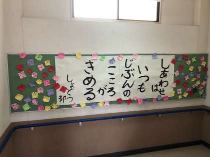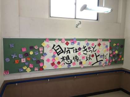 2階から3階へ上がる階段の掲示板には、1年生の美術の授業で制作した花と書道部が書き上げたメッセージが掲示されています。