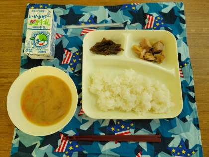 【献立】 まぐろの甘辛焼き 豚汁 くきわかめのつくだ煮