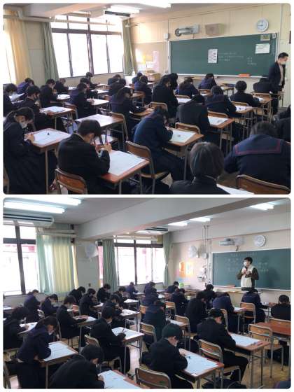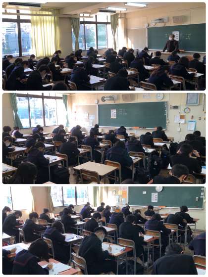 1年生の学年末テスト、本日は数学、社会、音楽の順にテストをします。