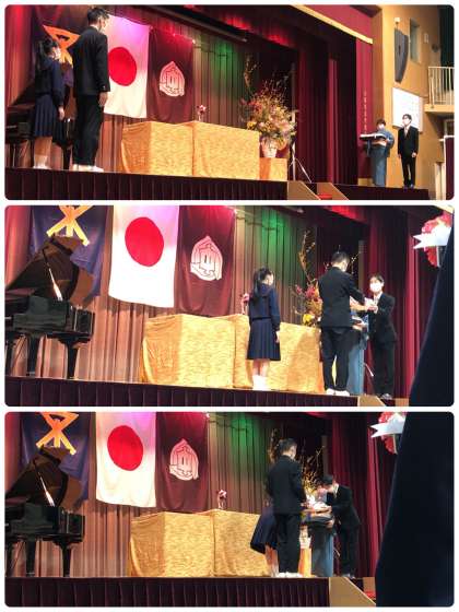 閉式の後、PTAより記念品の贈呈です。卒業証書ファイルをいただきました。