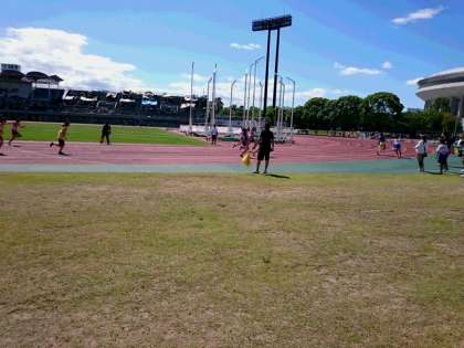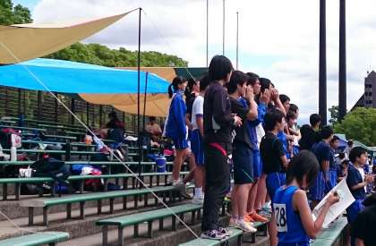 長居第二陸上競技場では、夕中陸上部がたくさんの競技に出場しています。応援の声もひとつになり、出場している選手もスタンドで応援している人も一丸となっています。