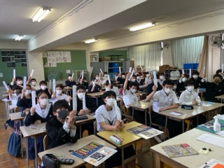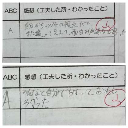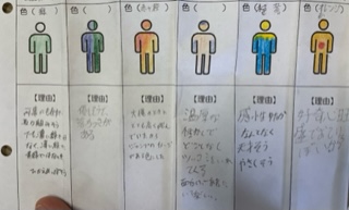 自分を色で表すならどんな色なのか、そして他の人を色で表すならどんな色なのか、色を塗り、その理由を書きました。自分が塗った色とみんなの色や理由を見比べ、人によって見方考え方はそれぞれであるということを学びました。