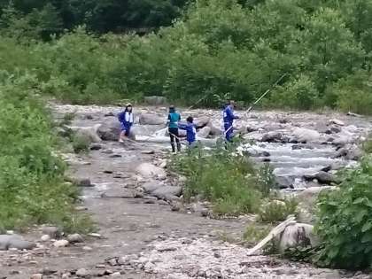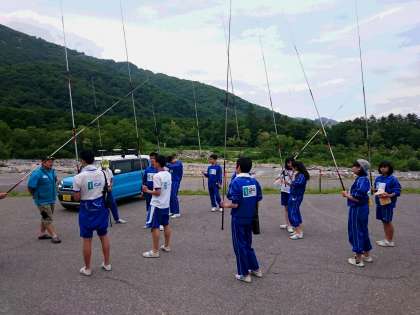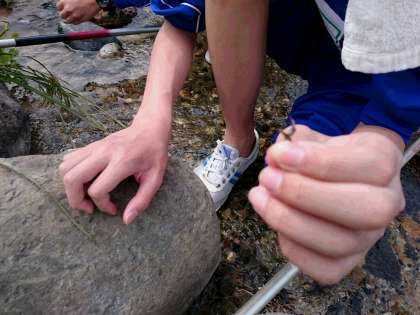 まず、指導員の方の説明を聞き、次に餌になるかげろうの幼虫を見つけ、針につけます。