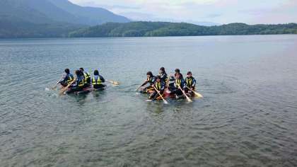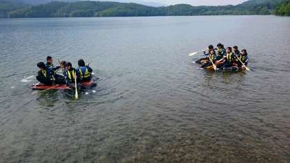 いかだ作りの様子です。見事に2組とも浮いています。バランスをとりながら前に進もう?