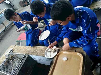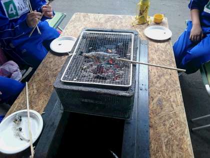 釣りチームは、川では釣れなかったので、釣り堀で釣りました。釣った魚を自分でさばき、網焼きにしました。