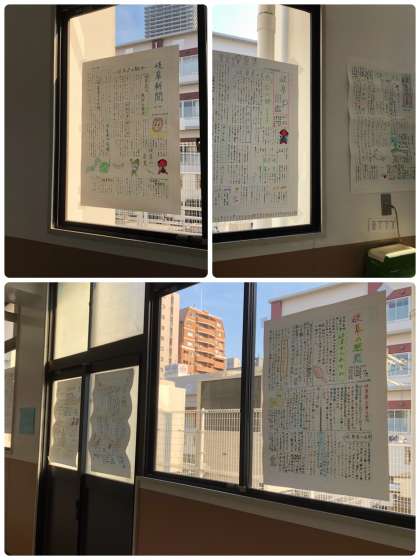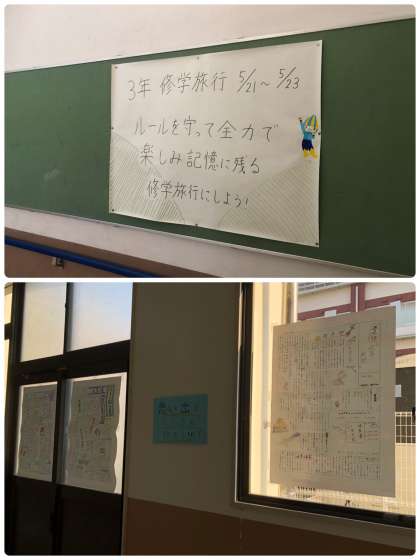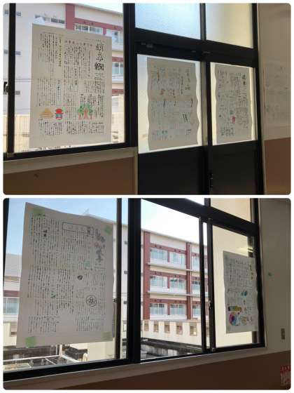 昨日完成した修学旅行に向けての壁新聞が廊下の窓に貼ってあります。お互いに書いたものを読んで、修学旅行への思いを高めていってほしいです。