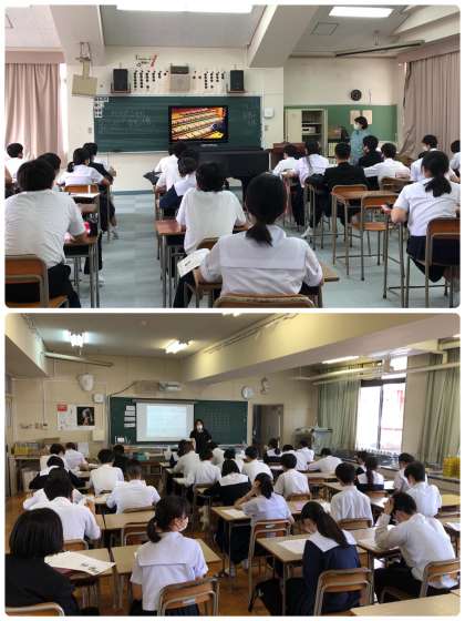 音楽、美術、英語、社会、数学の授業です。英語はC-NETの先生の授業です。