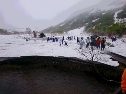 3日目の午前は栂池自然園まで、ゴンドラとロープウェイを使って上がりました。山上は結構な雨が降っていましたが、生徒たちは雪遊びを楽しみました。