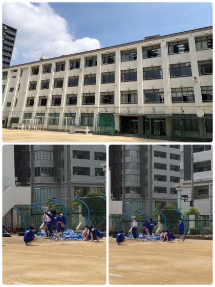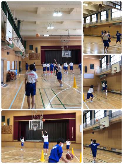 体育の授業です。男子はバスケットボール、女子は走り幅跳びを行っています。