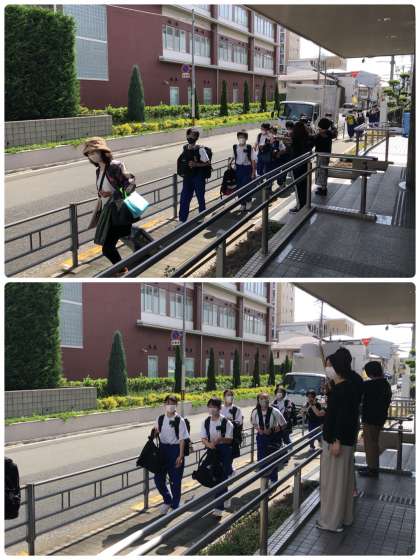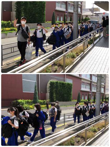 出発式を終え、学校からバスの停留しているところまで移動です。