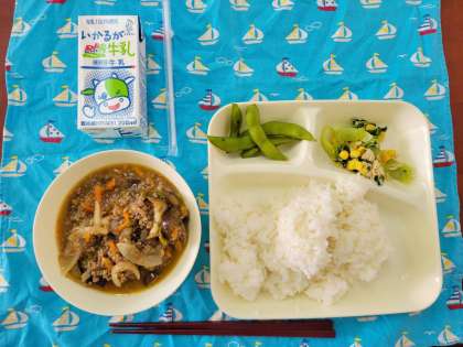 【献立】 マーボーなす チンゲンサイとコーンのいためもの えだまめ