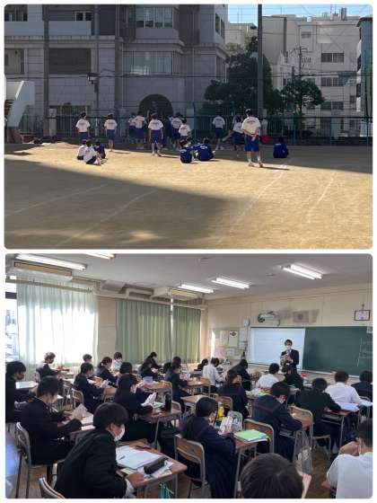 社会、数学(分割)、体育、英語の授業です。英語は教育実習生が授業をしています。