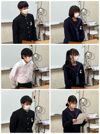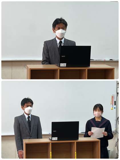 来年度から新しくなる標準服のエンブレムについての表彰がありました。夏に生徒の皆さんから募集したデザインの中から3点が選ばれ、その中から最優秀となったものがエンブレムのデザインとして採用されました。素晴らしい出来栄えです。