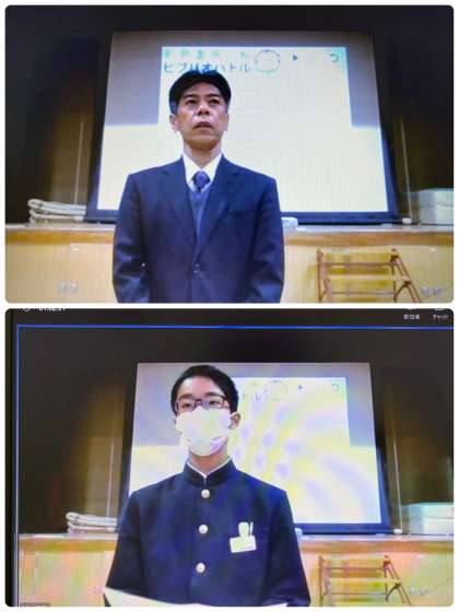2年生が1時間目にビブリオバトルを行うため体育館に集合していましたので、本日は体育館からのリモートです。2年生は体育館で校長先生の話を直接聞きました。