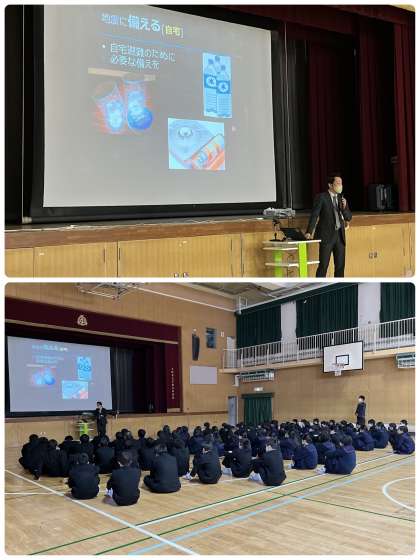 天王寺消防署、天王寺区役所の方に来ていただき、災害への備えについての話を聞かせていただいたり、様々な防災体験をさせていただきました。