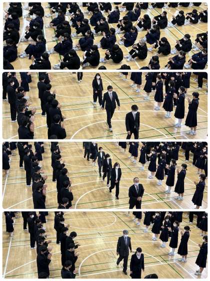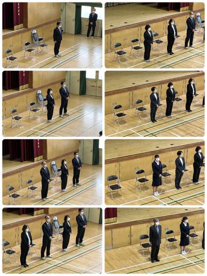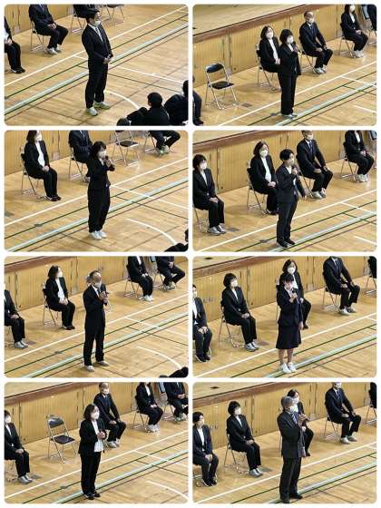 修了式に続いて、今年度限りで夕陽丘中学校を去られる先生方の離任式を行いました。