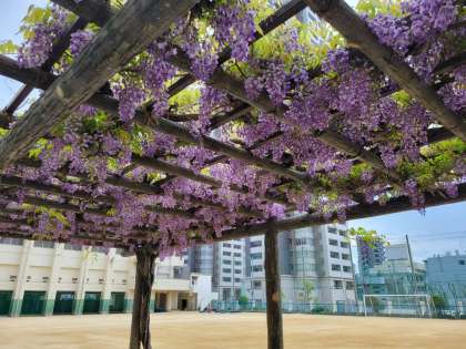 グラウンドの隅にある藤棚では、藤の花がきれいに咲いています。藤の花は日本古来の花で高貴な花として昔から親しまれていました。ぜひ一度見て欲しいと思います。