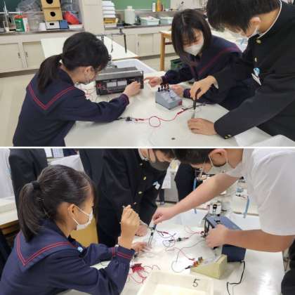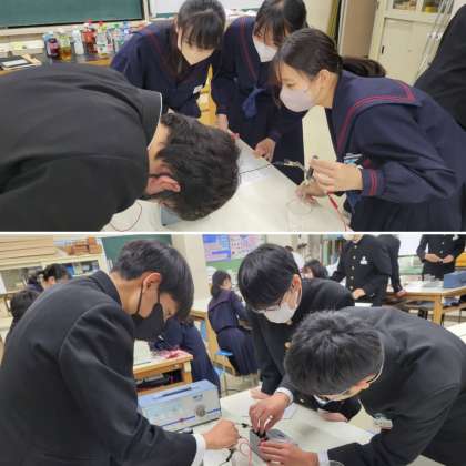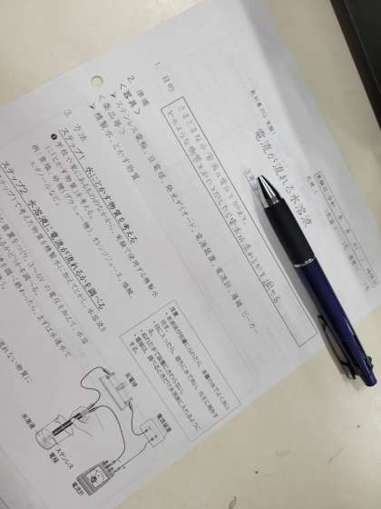 電流が流れる水溶液について学習しました。前回に班で話し合って決めた水溶液に、実際に電流が流れるかどうかの実験をしました。