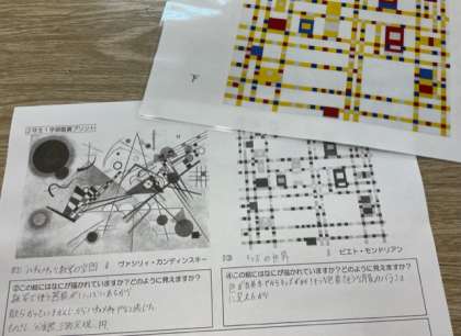 カンディンスキーとモンドリアンの作品を鑑賞しました。班で意見交換をした後に全体で共有しました。どちらも目に見えない音楽を見える形にした抽象絵画であり、1学期取り組む予定の音楽の抽象表現につなげていくきっかけとなりました。