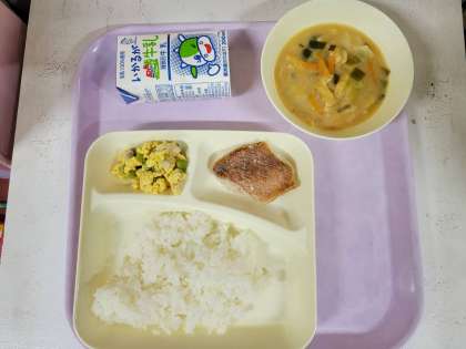 【献立】 あかうおのしょうゆだれかけ みそ汁 えんどうの卵とじ