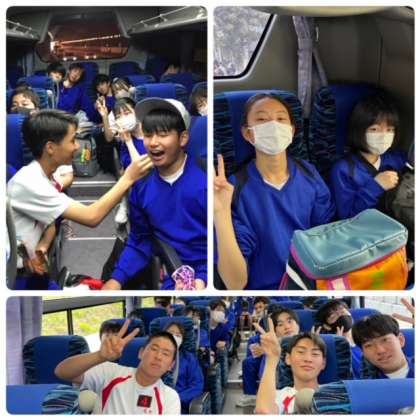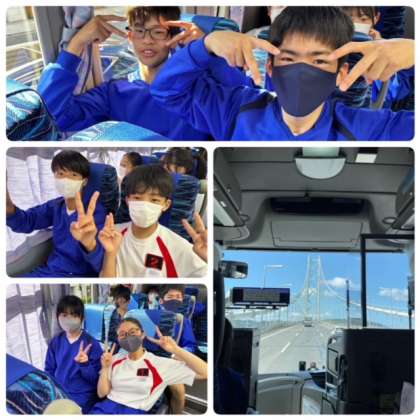 渋滞の影響により、レオマワールド到着が30分程遅れる予定です。バス内では、実行委員が作成したCDを聴きながら、お菓子タイムを楽しんでいます。まもなく室津SAでトイレ休憩です。