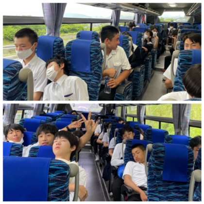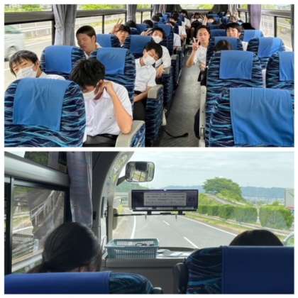 愛媛県に入りました。渋滞もなく、順調に松山市に向かっています。がんばって早起きしたせいか、バス内では眠っている人が増えてきました。
