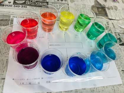 色料の三原色であるシアン、マゼンタ、イエローのインクから本当にいろんな色が作れるのか実験しました。班で話し合いながらインクの量を調整し、綺麗な色相のグラデーションができました。