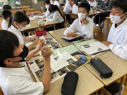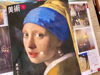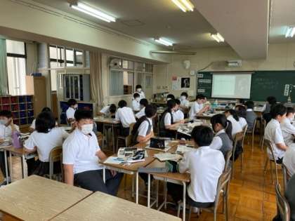 1年生の中学校生活初めての絵画鑑賞はフェルメールの「真珠の耳飾りの少女」と「牛乳を注ぐ女」それぞれ鮮やかなブルーとイエローが印象的な作品です。それぞれの少女は何を思い、何を話そうとしているのか考え、班で話し合い、全体で共有しました。