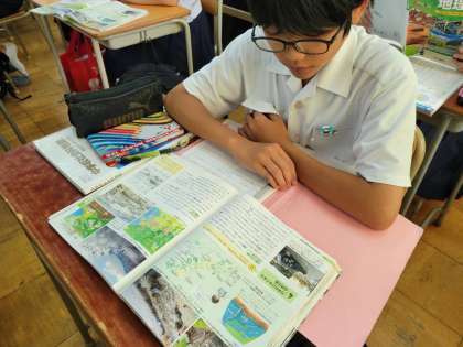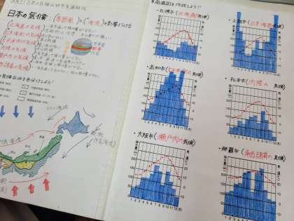 日本のさまざまな自然災害について学習しています。自分でノートをまとめたり、教科書を音読して気づいたことを書き出し共有したりしていました。