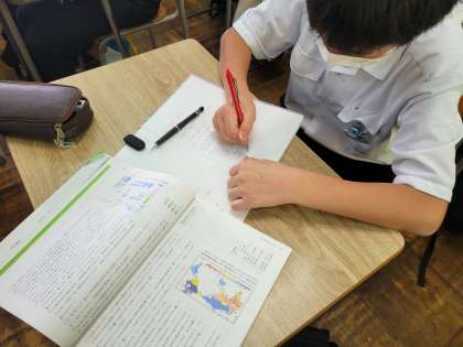 100年後の水を守るという評論文を学習しています。文章と図表から筆者の考えを読み取ることを目標に、学習に取り組みました。