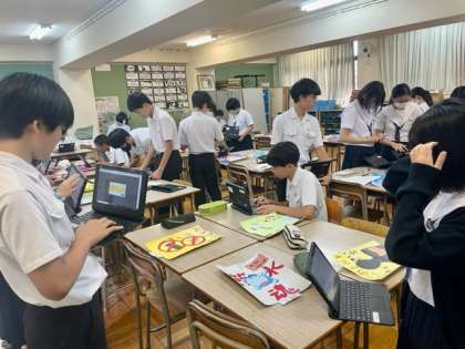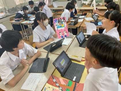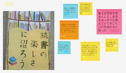 完成した作品の相互鑑賞をしました。ポスターを作ろうと思った経緯や工夫した点を班で発表し、その後全体鑑賞をしました。作品を見て思ったことを書き、タブレットで共有しました。