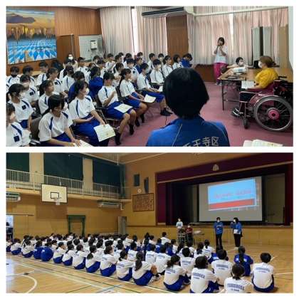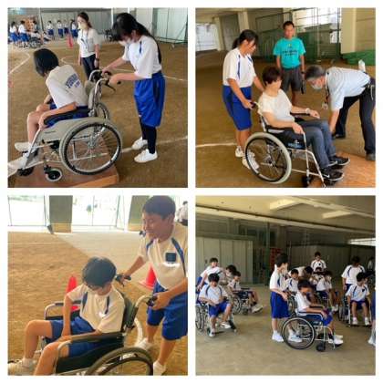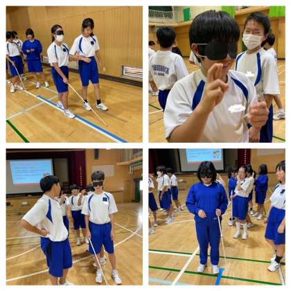 1年生は本日の5時間目と6時間目に地域からゆうあいとムーブメントの方に来て講話していただき、車椅子体験とアイマスク体験をしました。視界に制限がある方や普段から車椅子を使用している方たちの気持ちが少し垣間見れたように思います。