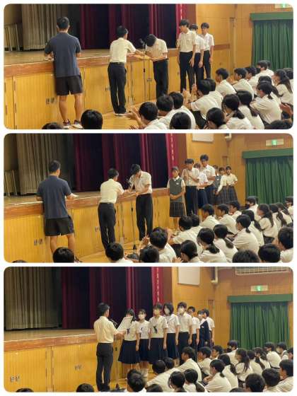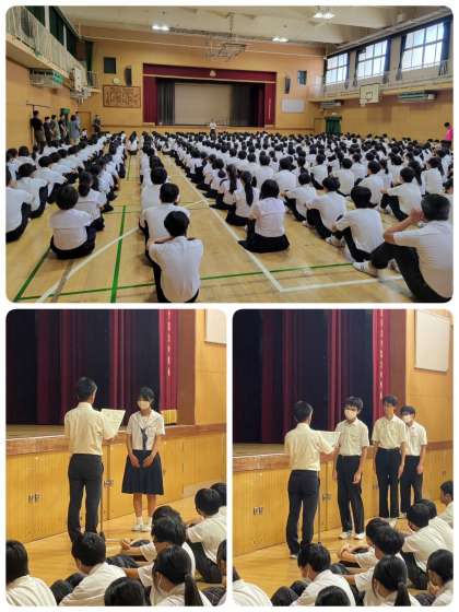 その後、合唱部、陸上競技部、バドミントン部、科学部、総文祭に美術の作品を出展した生徒の表彰がありました。みなさん、おめでとうございます。