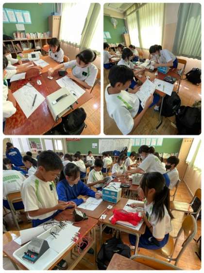 直列回路、並列回路を初めて自分たちで繋ぐので、みんなで四苦八苦しています。