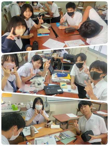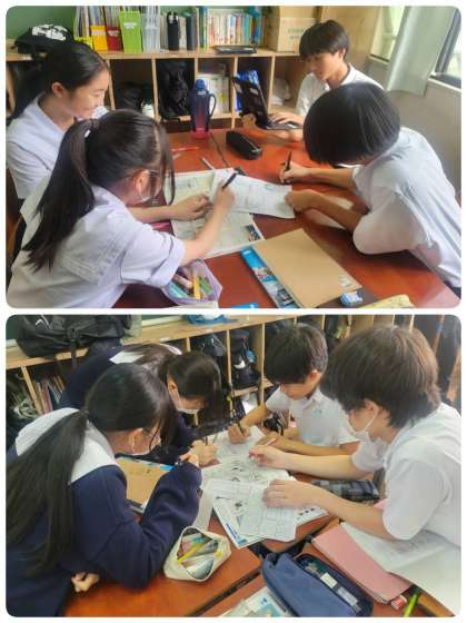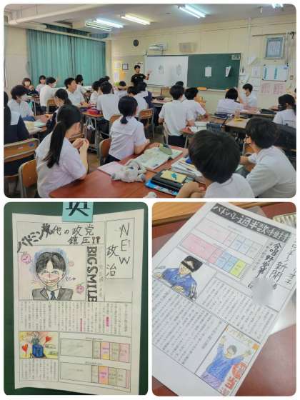 メデイアリテラシーの学習をしています。同じ内容の記事でも見出しが違うだけで読んでいる人の印象は大きく変わります。それを体験しようということで、各班ごとに新聞を作って見比べて見ました。それにしても、どの班も新聞のクオリティが高いですね。
