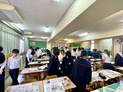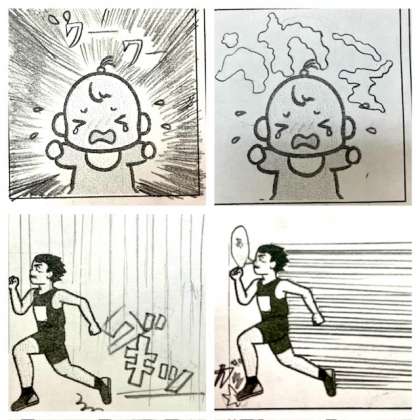 1つの絵からそれぞれ想像した場面や心情をオノマトペやスピード線、効果線を工夫して描きました。最後はお互いのプリントを見て意見を出しあいました。