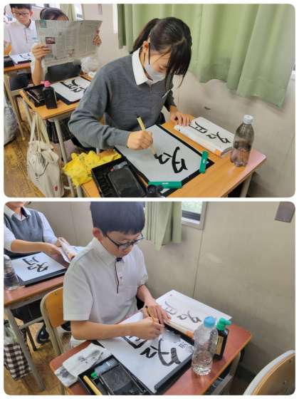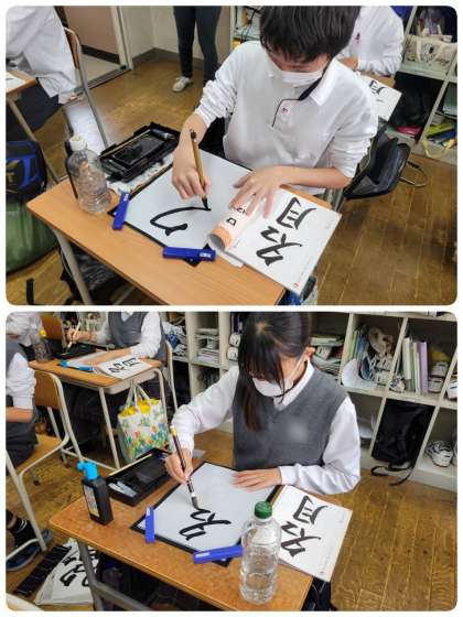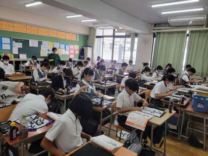 書道をしています。今日は名月と書いていました。得意な人が、多いようです。みなさん真剣に取り組んでいます。
