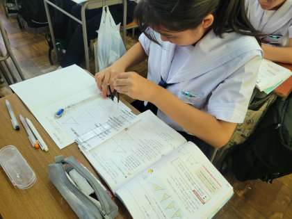 三角形の合同条件について学習しています。与えられた条件から三角形を作図してみて、一つに決まるかどうか考えています。2組の辺とその間でなはない角が分かっている場合、三角形は2種類かけてしまうんですね。