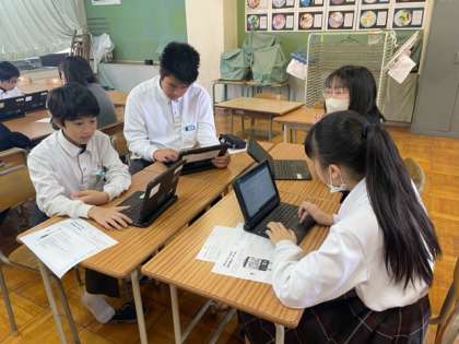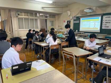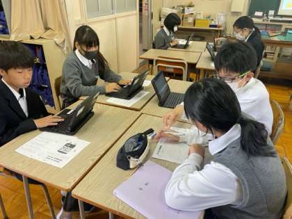 1年生の次の美術の課題は「日本を感じるガチャポン」です。外国の方に向けてまわして楽しい、開けて嬉しいガチャポンの中身を考えます。日本らしいものとはどんなものがあるのかを考え、ワークシートに打ち込み、発表しました。