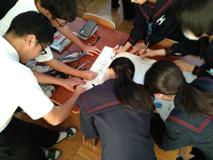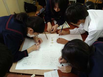 2年生は校外学習に向けて、壁新聞を作製しています。班のメンバーと手分けし、協力しながら1枚の新聞を完成させています。