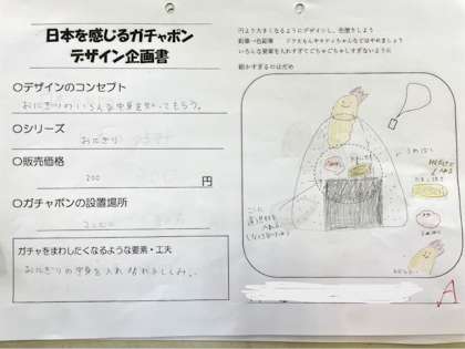 ?ガチャポンの中身の企画書を作っています。デザインのコンセプトやシリーズを考え、ガチャポンの中身に何かプラスで、取り外しができる、においをつける、実際に遊べる、光るなどがあれば面白いのではないかという意見が出ました。