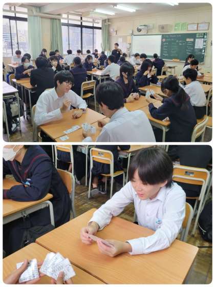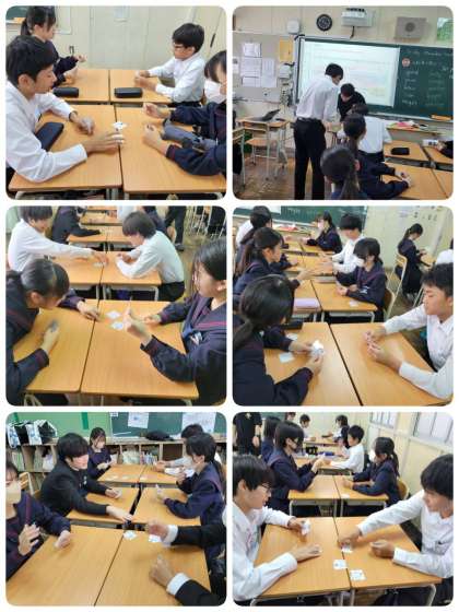 比較級について学習しています。授業の最後に、習ったことを使うカードゲームをしました。各テーブルで熱いバトルが繰り広げられていました。