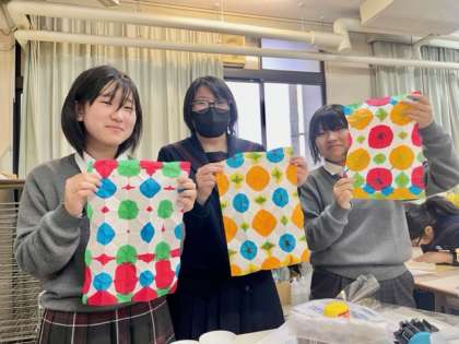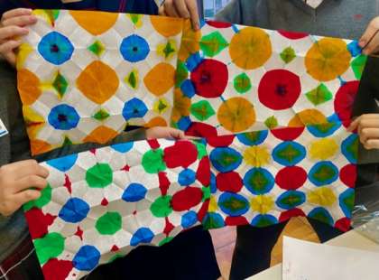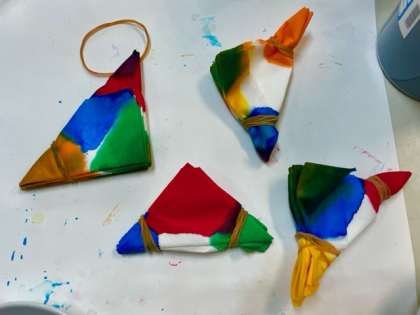 和紙を使って雪花絞りをしました。着物などにも使われる技法で、簡単で綺麗な柄ができました。