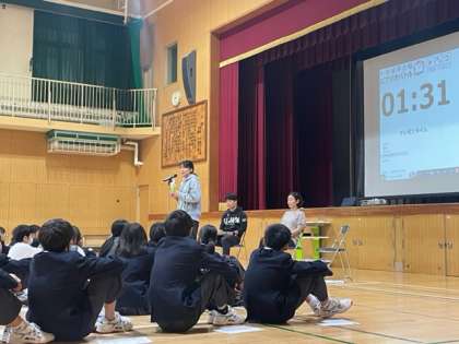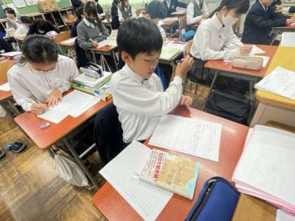 1年生でビブリオバトルの取り組みが始まりました。先生からデモンストレーションがあり、イメージが湧きました。教室に戻ってからは、発表の原稿を考えました。